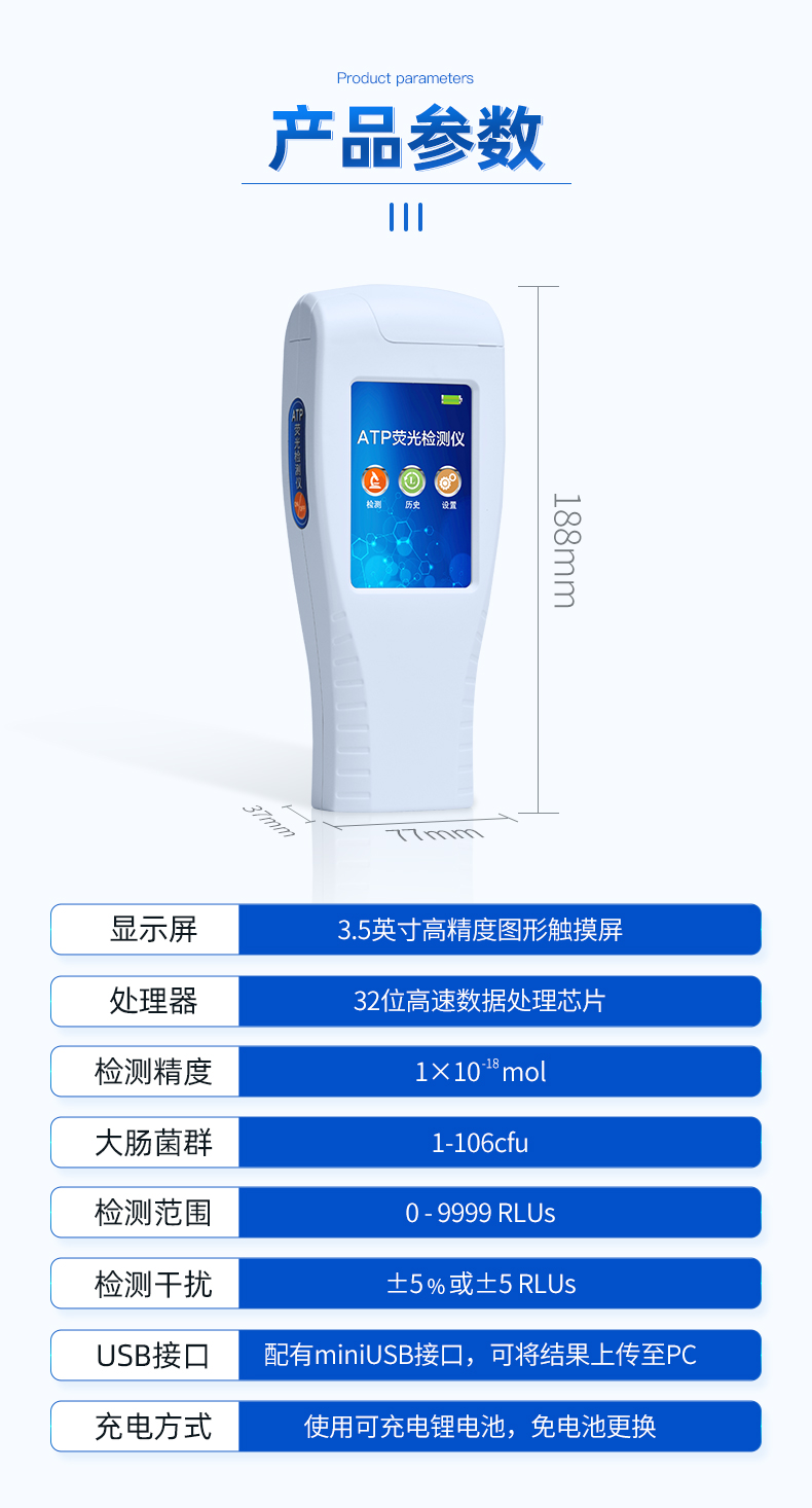 該設備為全新升級產品,大屏幕觸摸顯示屏,代替傳統按鍵。操作采用生物化學反應方法檢測ATP含量,ATP熒光檢測儀基于螢火蟲發光原理,利用“熒光素酶—熒光素體系”快速檢測三磷酸腺苷(ATP)。ATP拭子含有可以裂解細胞膜的試劑,能將細胞內ATP釋放出來,與試劑中含有的特異性酶發生反應,產生光,再用熒光照度計檢測發光值,微生物的數量與發光值成正比,由于所有生物活細胞中含有恒量的ATP,所以ATP含量可以清晰地表明樣品中微生物與其他生物殘余的多少,用于判斷衛生狀況。