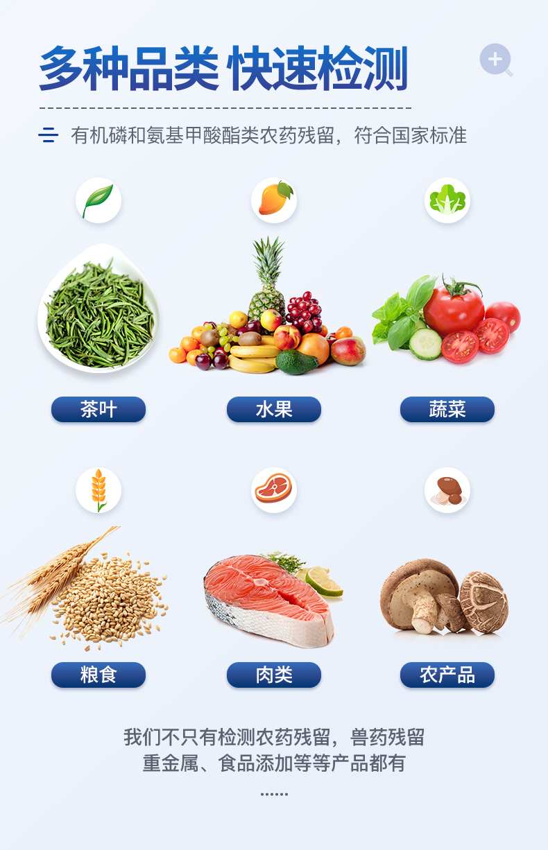 檢測標(biāo)準(zhǔn):依據(jù)國家標(biāo)準(zhǔn)方法(GB/T5009.199-2003)以及世界衛(wèi)生組織WHO、世界糧農(nóng)組織FAO殘留農(nóng)藥檢測標(biāo)準(zhǔn)、世界環(huán)境保護(hù)局EPA參照攝入量等要求來設(shè)計(jì)。采用酶抑制率比色法對水果、蔬菜等農(nóng)林產(chǎn)品中有機(jī)磷和氨基甲酸酯類農(nóng)藥含量進(jìn)行快速準(zhǔn)確的檢測。