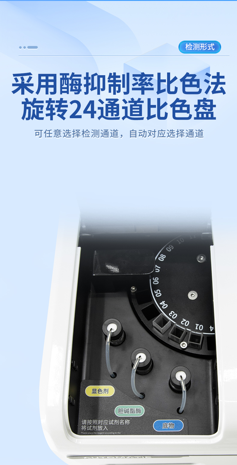 | 1. 試劑位置:3個 | 2. 檢測形式:旋轉24通道比色盤,可任意選擇檢測通道,自動對應選擇通道。 | 3. 系統配置:10.1寸高清液晶觸摸屏,采用ARM Cortex?-A7,RK3288/4核處理器,運行內存1GB。Android7.1.1 系統分辨率1280×800。 | 4.恒溫系統:具有自動加溫溫控系統,精準恒溫37℃,精度±0.1℃。 | 5.添加系統:儀器按照試劑要求自動、按時、按量加入試劑,并且自動對未正常放置的樣本或異常的樣本進行檢查并提示。 | 6.清洗功能:儀器具備回流及自動清洗管路功能,避免試劑污染。 | 7.混勻功能:設備具備自動混勻功能。 | 8.光源校準:設備可自動校準,確保檢測準確度。 | 9.實時監控:儀器測試過程中屏幕顯示運行狀態,可實時查看。 | 10.數據存儲:內部存儲16GB,可存儲500萬條數據。 | 11.樣品多選功能:設備具備樣品一鍵多選功能,選擇樣品自動匹配檢測通道。 | 12.項目預設:可提前設置單個及多個相同或不相同的檢測任務,可單次或者多次調取,減少檢測時間。 | 13.自定義打印系統:內置自定義打印系統,可按需靈活設置開啟或關閉:產品合格證(國家農業部標準),二維碼,抽樣信息、檢測信息,受檢信息等信息的打印。 | 14.A4版本報告打印功能:設備可自動生成A4版報告,A4報告帶二維碼,可掃描二維碼生成電子版,并可識別真偽。 | 15.傳輸方式:儀器配備無線通信模塊: 4G(APN)通訊模塊、Wifi模塊,藍牙傳輸模塊,同時具有USB接口以及RJ45接口能以多種方式實現數據保存和數據傳輸功能,設備數據可以同步上傳至平臺。 | 16.數據監管系統:設備自帶監管平臺,并可同步對接監管平臺,數據可局域網和互聯網數據上傳,檢測結果可直接傳至食品安全監管平臺。達到食品安全問題預估、預警。 | 17.系統遠程更新功能:無需設備返廠,即可遠程實時升級全新系統,節省時間成本及避免運輸造成設備損。 |
