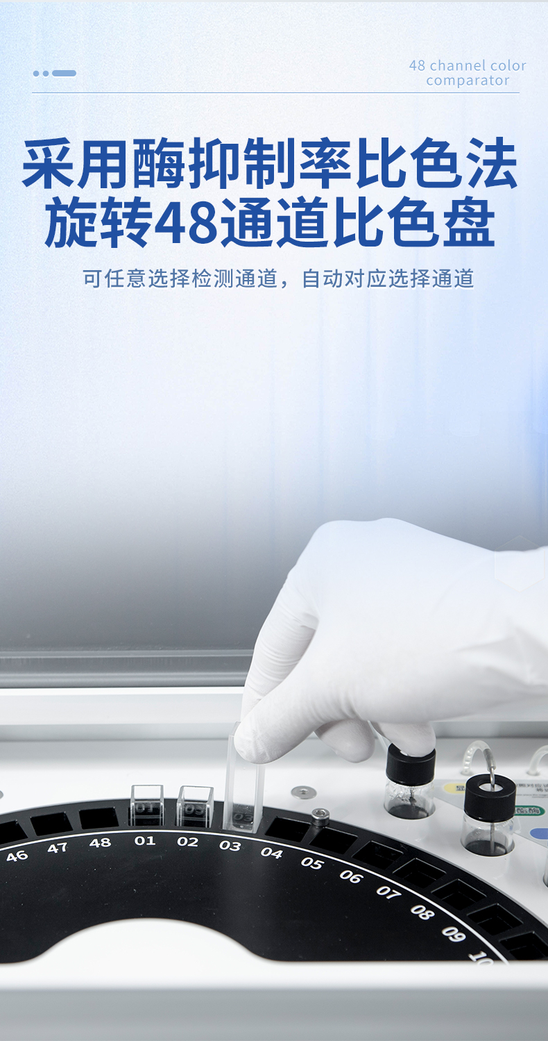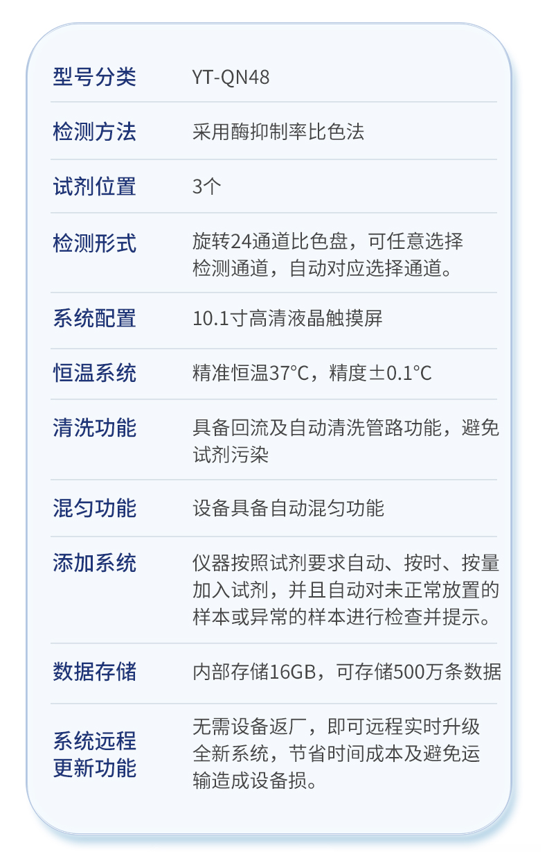 | 1. 試劑位置:3個 | 2. 檢測形式:旋轉48通道比色盤,可任意選擇檢測通道,自動對應選擇通道。 | 3. 系統配置:10.1寸高清液晶觸摸屏,采用ARM Cortex-A7,RK3288/4核處理器,運行內存1GB。Android7.1.1 系統分辨率1280×800。 | 4.恒溫系統:具有自動加溫溫控系統,精準恒溫37℃,精度±0.1℃。 | 5.添加系統:儀器按照試劑要求自動、按時、按量加入試劑,并且自動對未正常放置的樣本或異常的樣本進行檢查并提示。 | 6.清洗功能:儀器具備回流及自動清洗管路功能,避免試劑污染。 | 7.混勻功能:設備具備自動混勻功能。 | 8.光源校準:設備可自動校準,確保檢測準確度。 | 9.實時監控:儀器測試過程中屏幕顯示運行狀態,可實時查看。 | 10.數據存儲:內部存儲16GB,可存儲500萬條數據。 | 11.樣品多選功能:設備具備樣品一鍵多選功能,選擇樣品自動匹配檢測通道。 | 12.項目預設:可提前設置單個及多個相同或不相同的檢測任務,可單次或者多次調取,減少檢測時間。 | 13.自定義打印系統:內置自定義打印系統,可按需靈活設置開啟或關閉:產品合格證(國家農業部標準),二維碼,抽樣信息、檢測信息,受檢信息等信息的打印。 | 14.A4版本報告打印功能:設備可自動生成A4版報告,A4報告帶二維碼,可掃描二維碼生成電子版,并可識別真偽。 | 15.傳輸方式:儀器配備無線通信模塊: 4G(APN)通訊模塊、Wifi模塊,藍牙傳輸模塊,同時具有USB接口以及RJ45接口能以多種方式實現數據保存和數據傳輸功能,設備數據可以同步上傳至平臺。 | 16.數據監管系統:設備自帶監管平臺,并可同步對接監管平臺,數據可局域網和互聯網數據上傳,檢測結果可直接傳至食品安全監管平臺。達到食品安全問題預估、預警。 | 17.系統遠程更新功能:無需設備返廠,即可遠程實時升級全新系統,節省時間成本及避免運輸造成設備損。 |