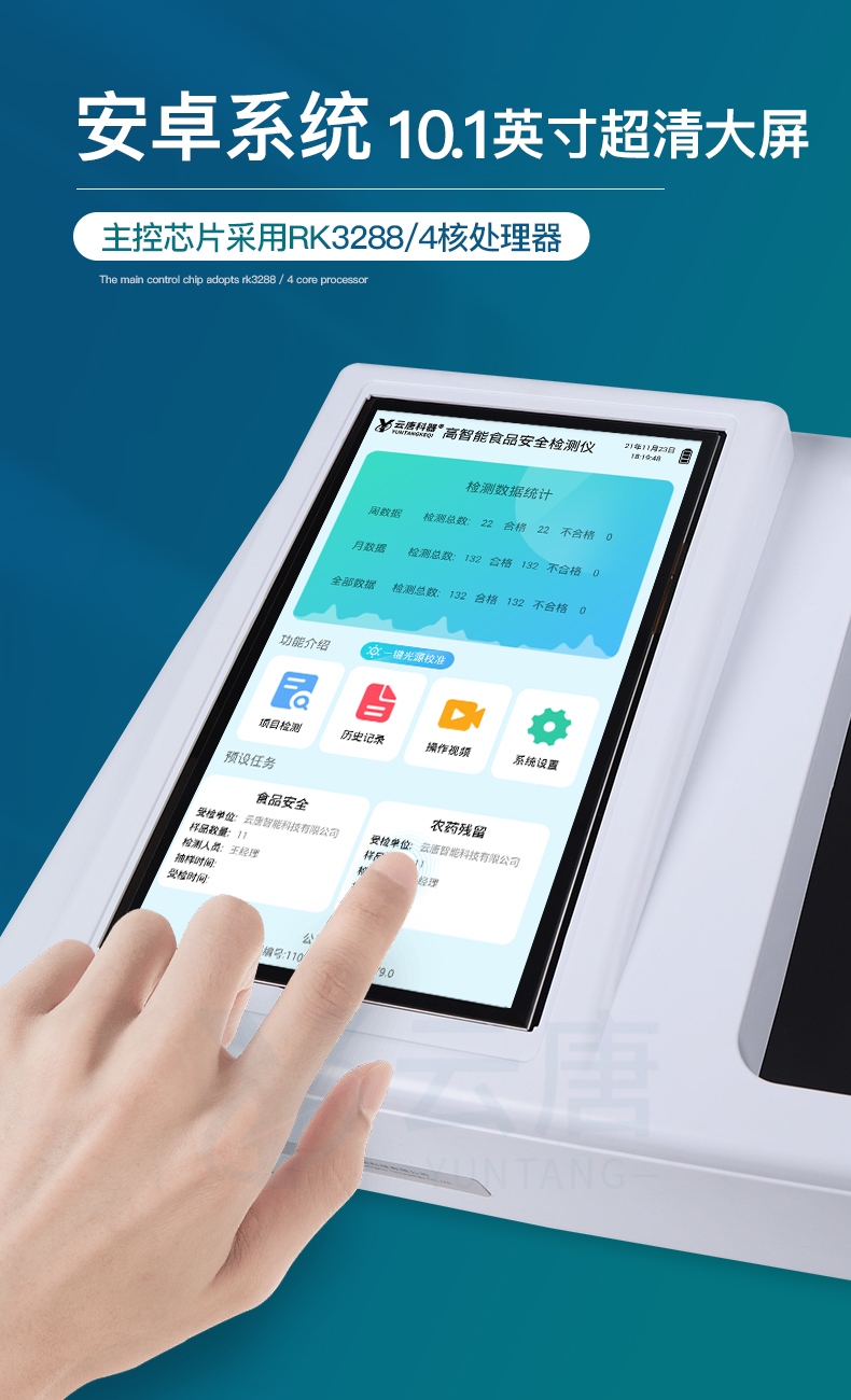 山東云唐智能科技有限公司生產的高智能食品安全檢測儀為集成化食品安全快速檢測分析設備,采用臺式一體化設計,可快速檢測200多種食品安全項目,包含非食用化學物質、濫用食品添加劑、農藥殘留、重金屬、病害肉、營養強化劑等項目的定量檢測。