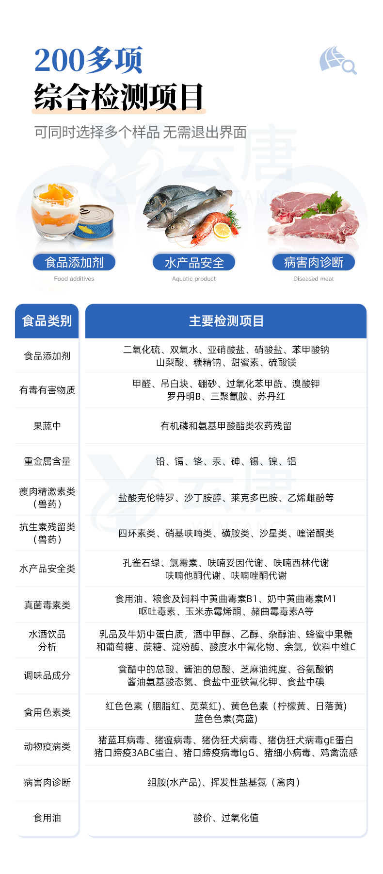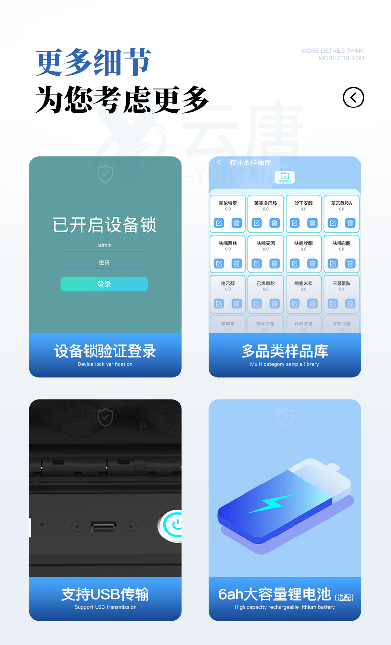 先咨詢優惠福利,再購買,價格更便宜,更實惠。 在線咨詢 技術問題山東云唐智能科技有限公司生產的高智能食品安全檢測儀可快速檢測200多種食品安全項目,包含非食用化學物質、濫用食品添加劑、農藥殘留、獸藥殘留、重金屬、病害肉、營養強化劑、抗生素類殘留、激素類殘留、真菌毒素類殘留、化學類殘留等項目的定性定量檢測。