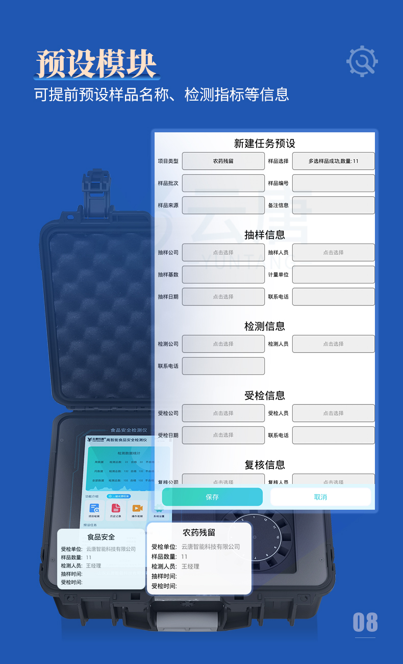 *6、儀器具有任務預設模塊,可在樣品送檢前提前預設樣品名稱、檢測指標、送檢單位等信息,樣品送檢時一鍵調取保存信息,檢測更加方便快捷。
