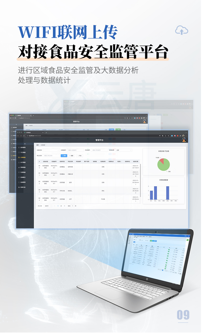 12、儀器具有 wifi 聯網上傳、RJ45網線連接功能,可以快速上傳數據。同步對接監管平臺,數據可局域網和互聯網數據上傳,檢測結果直接傳至食品安全監管平臺。進行區域食品安全監管及大數據分析處理與數據統計,檢測區域食品安全長短期動態,達到食品安全問題預估、預警。