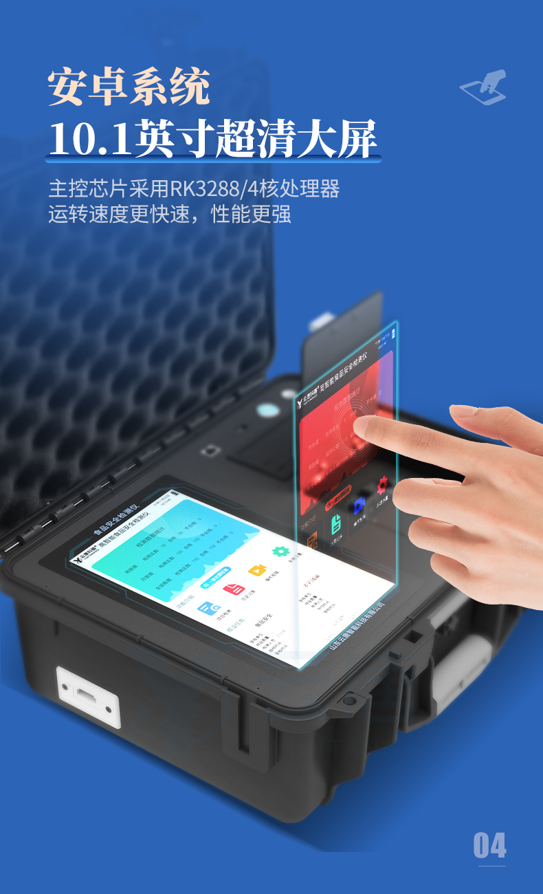 食品安全檢測儀器設備采用10.1英寸液晶觸摸屏顯,搭配運行安卓智能操作系統,主控芯片采用ARM Cortex-A7,RK3288/4核處理器,主頻··· 熱線:133-7109-8225