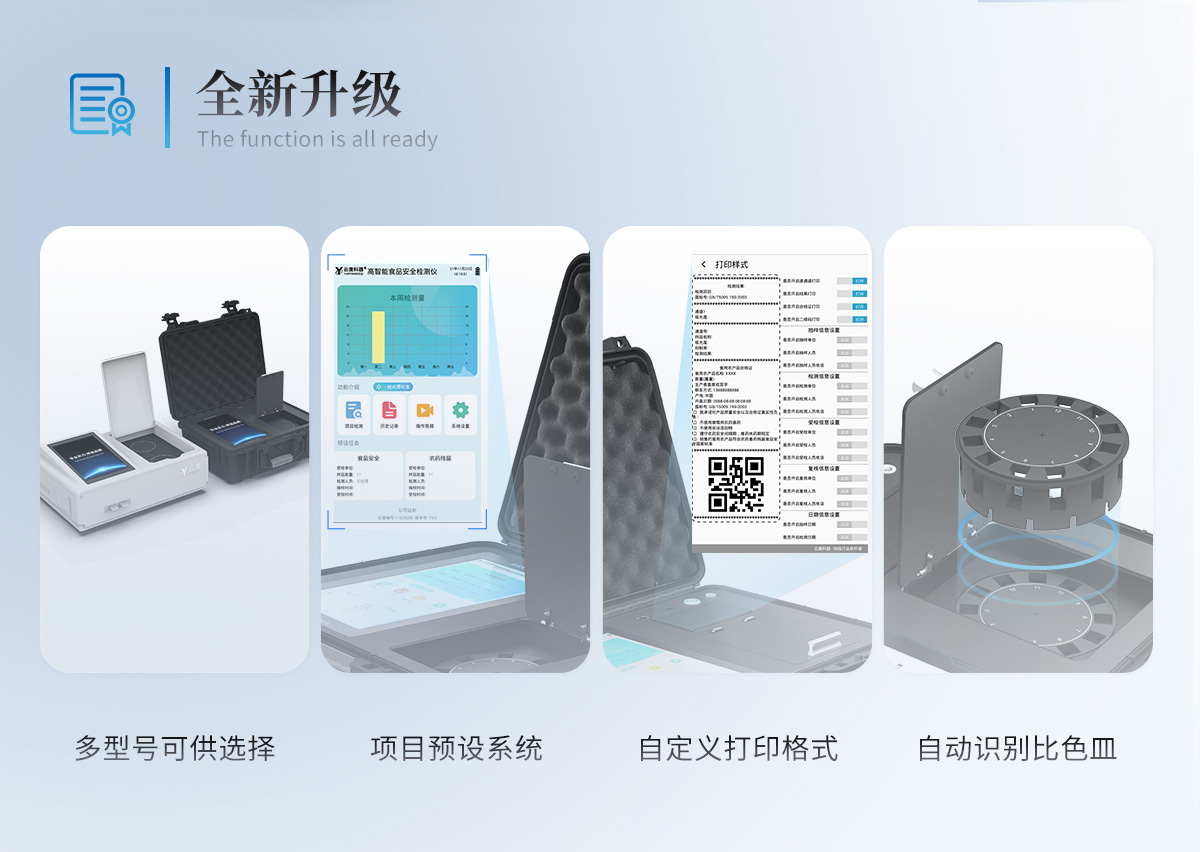 1、儀器采用手提式一體化系統檢測技術,將分光光度模塊、膠體金檢測模塊、新型農殘檢測模塊、數字化管理模塊、無線通訊模塊高度集成于一體,支持檢測200種食品安全檢測項目,同時預留升級檢測方法。